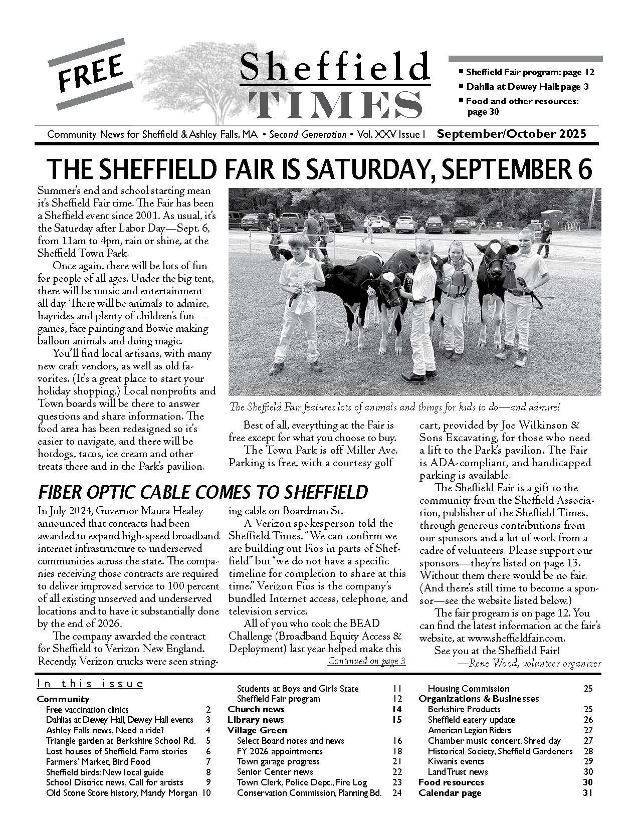 The Sheffield Times is a free community newsletter for Sheffield, Massachusetts. It is published bimonthly by the Sheffield Association and available at the Sheffield Library, boxes outside Gulotta’s Mobil Station and the Ashley Falls Post Office, and other locations around town. We also publish special issues with profiles of the candidates in local elections and the verbatim contents of Town Warrants.